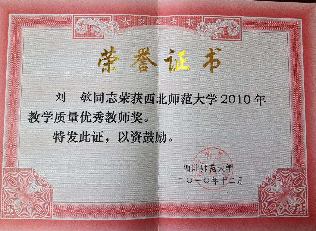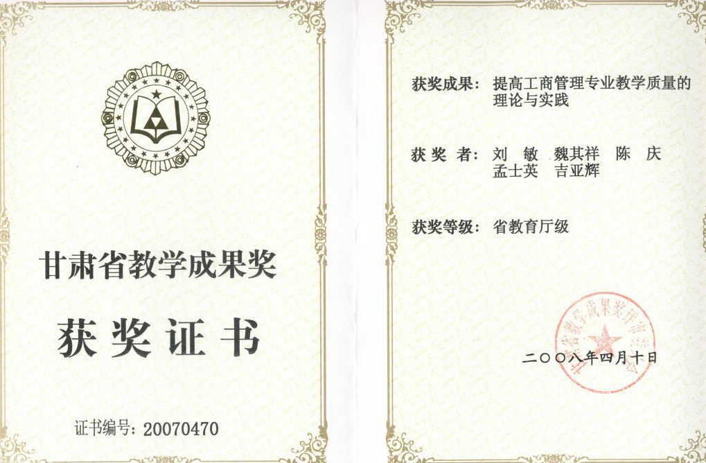 10.2008年,甘肃省优秀教学成果厅级奖.