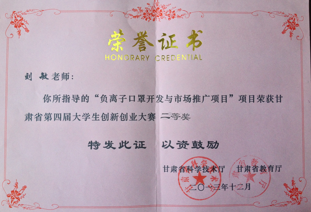 4.2013年,指导“负离子口罩开发与市场推广”项目获甘肃省第四届老员工创新创业大赛二等奖.