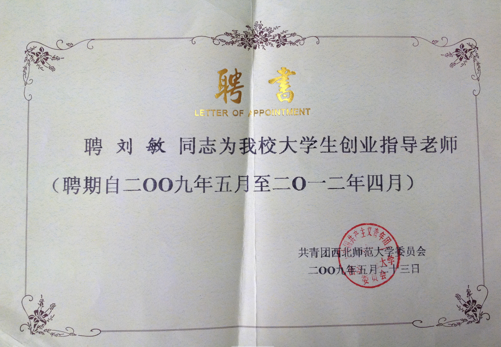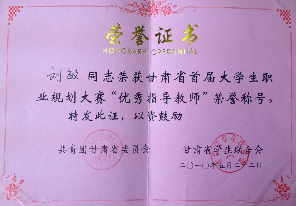 3.2013年,甘肃省创业计划大赛“优秀指导教师”.