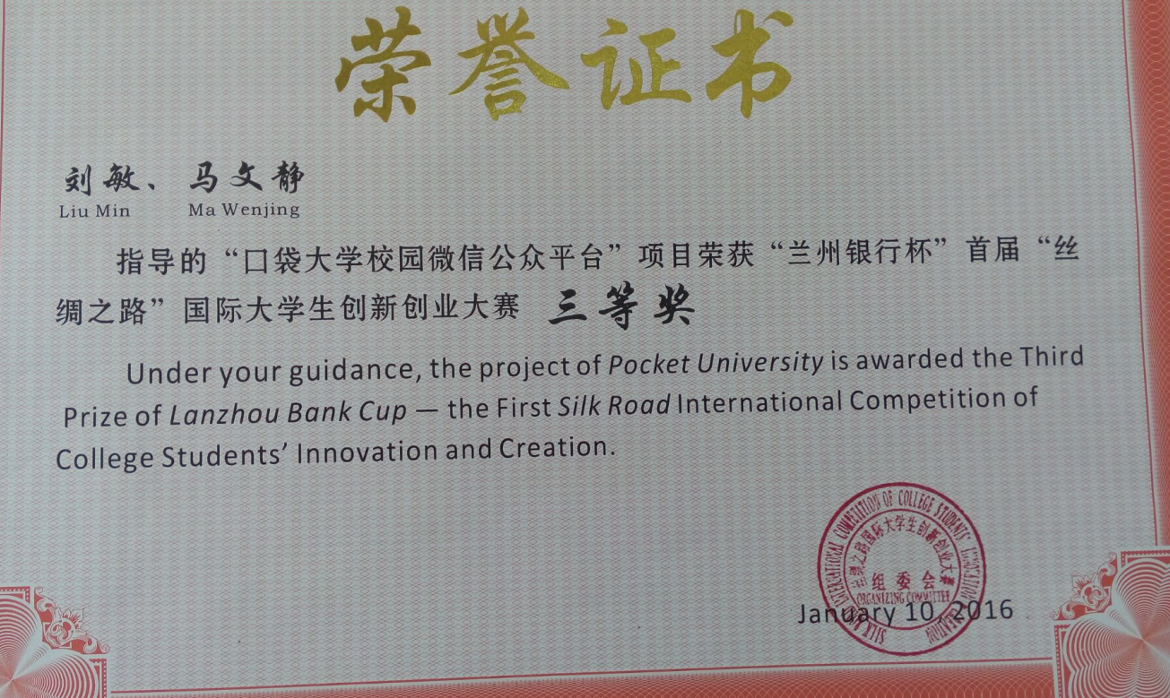 1.2016年,指导“口袋大公司园公众平台”项目获“兰州银行杯”首届“丝绸之路”国际老员工创新创业大赛三等奖,甘肃省第六届老员工创新创业大赛二等奖.