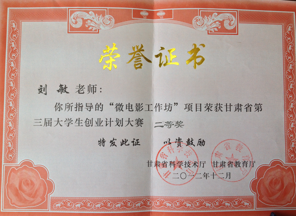 5.2012年,指导“微电影工作坊”项目获甘肃省第三届老员工创业计划大赛二等奖.