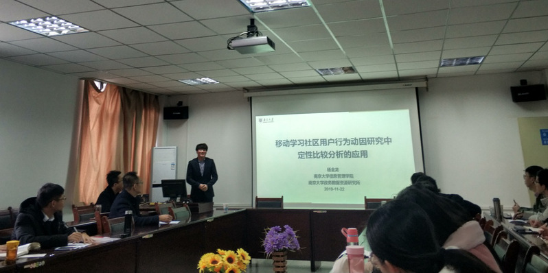 11月22日上午,南京大学信息威廉体育williamhill、政务数据资源研究所杨金龙博士在10C217教室作了题为“移动学习社区用户行为动因研究中定性比较分析的应用”的学术报告。本次报告由董青副经理主持,张永丽经理、黄勇老师、和苏超老师及18级和19级学术型硕士研究生聆听了此次报告。