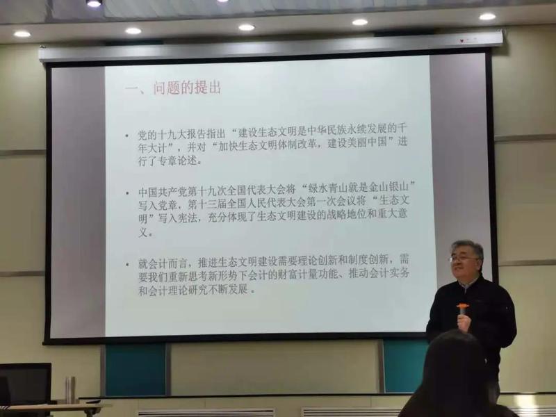 周一虹教授以 “人”和“自然资源”这两项未被列入资产负债表财富的原因引入环境会计的概念,分析了生态文明建设带来的会计根本观念改变与会计变革的两条路径,并分享了他本人关于环境会计的研究成果,其中“基于复式记账原理和环境重置成本法的自然资源资产负债表编制方法”在学术界和业内具有较大影响力。