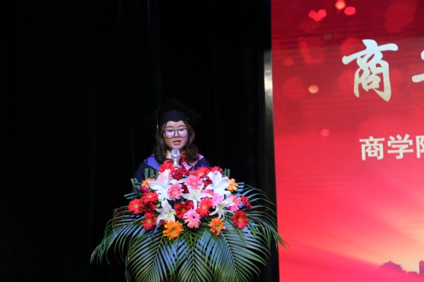 2017级物流管理班何春贵作为本科生毕业生代表发言。何春贵首先感谢曾经教导、陪伴和帮助自己的师长和亲友们。在奔向人生下一站之际她分享了自己的期待:“让我们牢记公司的嘱托,老师的教诲,秉承知术欲圆,行旨须直的校训,‘弘道求是,知术乐商’的院训努力前行。‘士不可以不弘毅,任重而道远’,以时间为证,我们一定会成为拥有理想并富有智慧的人,德才兼备并勇于创新的人,富有责任并敢挑重担的人。在明天的舞台上,乘风破浪,挥斥方遒。”