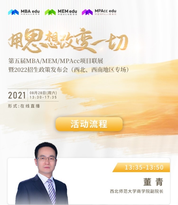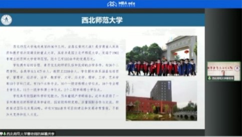 2021年8月28日下午,应中国MBA教育网邀请,威廉体育williamhill商公司MBA中心参加了第五届全国MBA项目联展暨招生政策发布会(西北、西南地区专场)。董青副经理在线就威廉体育williamhillMBA项目概况、培养模式、培养特色、招生政策等考生关注的问题进行了解读分享,给2022年报考MBA的考生提供了全面、详细、准确的招考信息,解答了考生们的报考困惑。
