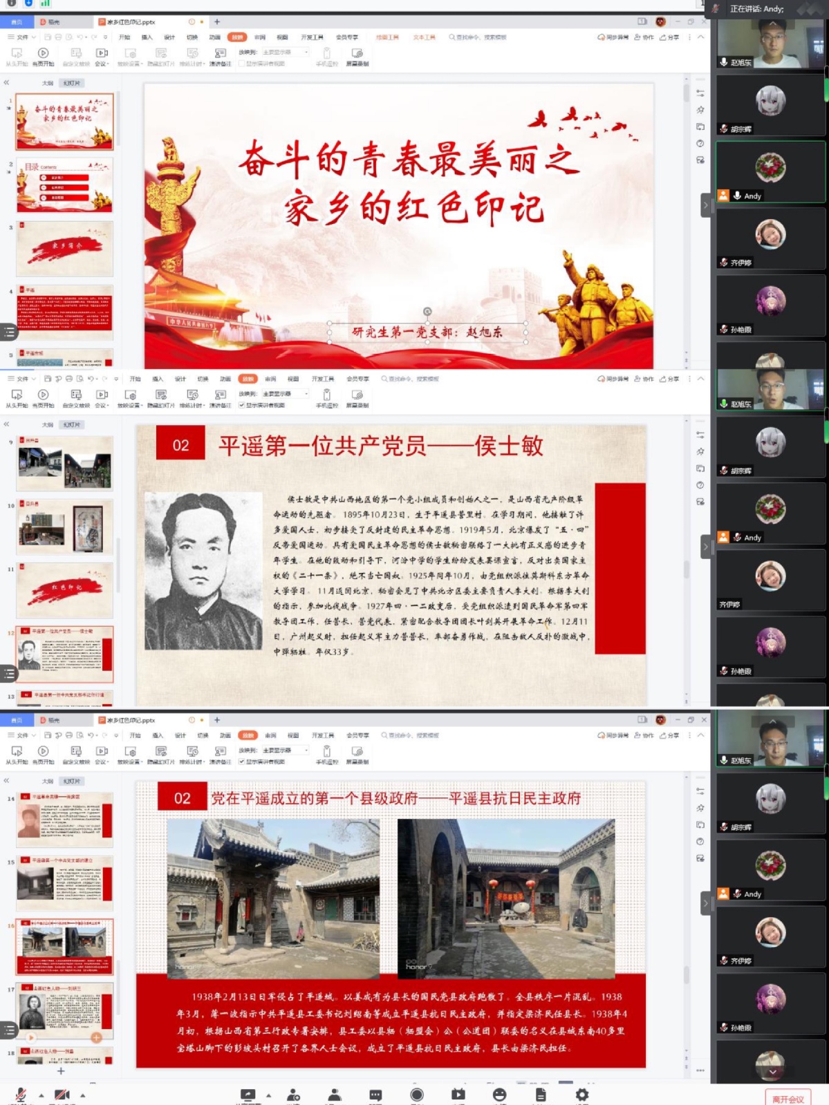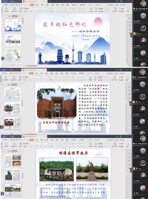 为探寻红色印记、了解革命事迹、传承红色基因,2021年8月19日,研究生第一党支部通过视频会议的方式举办“奋斗的青春最美丽”之“家乡的红色印记”分享活动。