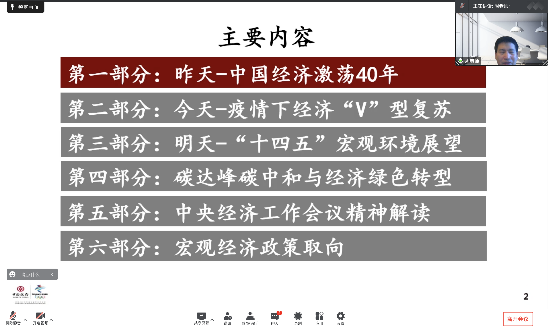 周景彤研究员回顾了改革开放四十年中国经济发展的辉煌历程,分析了当前疫情下中国经济的复苏状况态势,展望了“十四五”期间中国经济发展的宏观环境,解释了碳达峰及绿色经济转型的战略意义,解读了中央经济工作会议精神,并对未来我国的宏观经济政策取向进行了分析。报告中,周景彤研究员运用深厚的理论功底、丰富的实践经验、翔实的经济数据、典型的金融案例、深刻的行业洞见带领师生纵览了中国经济发展取得的伟大成就,认识当前中国经济发展的现状及困境,展望未来中国经济发展的前景和市场新机遇。