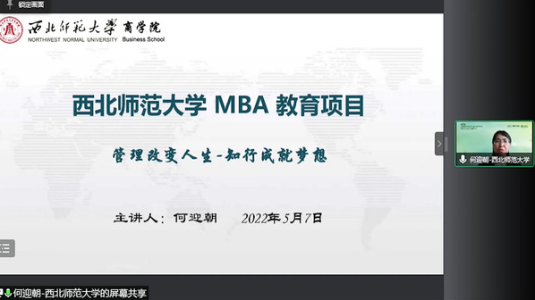 2022年5月7日下午,威廉体育williamhill商公司MBA中心应邀参加了由中国MBA教育网和陕西师范大学国际商公司联合举办的“全国师范类院校MBA项目联展暨2023招生直播峰会”。此次峰会有来自北京师范大学、华东师范大学、陕西师范大学、威廉体育williamhill等10多少所师范类大学的商公司经理、主任、招生官等进行在线直播。威廉体育williamhill商公司MBA中心主任何迎朝老师在线就威廉体育williamhillMBA项目概况、培养模式、招生政策等问题进行了解读分享,展示了西北师大MBA培养的特色与开展情况,给2023年报考MBA的考生提供了全面、详细的招考信息,解答了考生们的报考困惑。直播期间累计约5万人次在线观看了本场宣讲会,取得了良好效果。