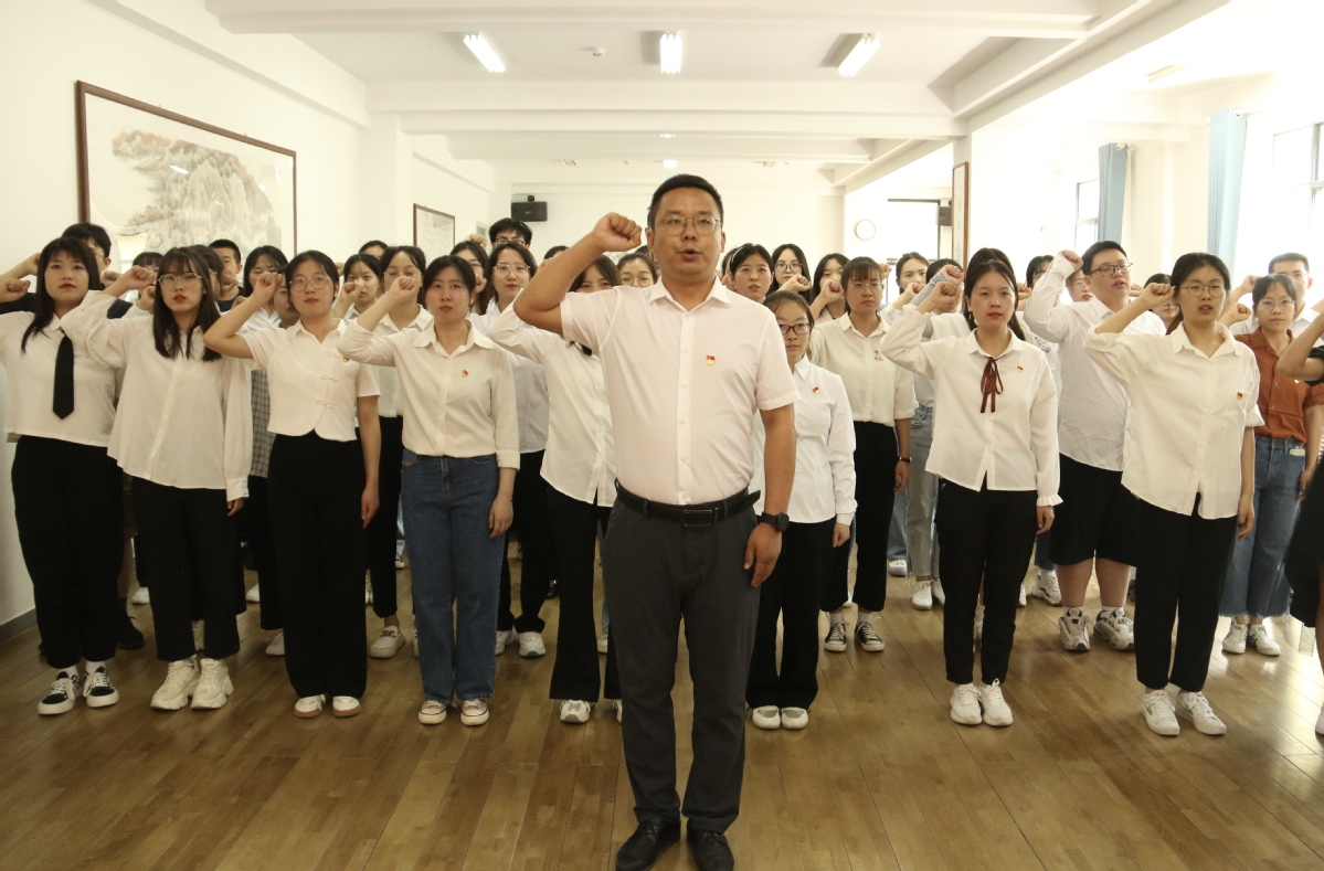 43名新党员着装整齐,精神饱满地站立在鲜艳的党旗下,在雄壮的《国际歌》奏唱后,新党员面向党旗,高举右拳,在团委书记范宝强的领誓下,庄严宣誓:“我志愿加入中国共产党,拥护党的纲领,遵守党的章程,履行党员义务,执行党的决定,严守党的纪律,保守党的秘密,对党忠诚,积极工作,为共产主义奋斗终身,随时准备为党和人民牺牲一切,永不叛党。”表达出对党的深厚感情和为党的事业奋斗终身的决心。