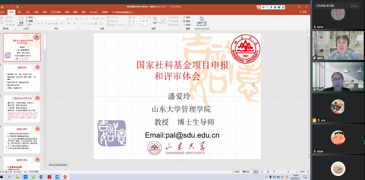 2022年9月22日,应威廉体育williamhill商公司邀请,山东大学二级教授、博士生导师潘爱玲为公司教师在线作题为《国家社科基金项目申报和评审体会》的学术报告。报告由张永丽老师主持,公司领导、专任教师及部分研究生共100余人在线聆听了报告。此次报告为威廉体育williamhill120年双甲子校庆、威廉体育williamhill商公司10周年院庆、博雅讲堂系列学术活动。