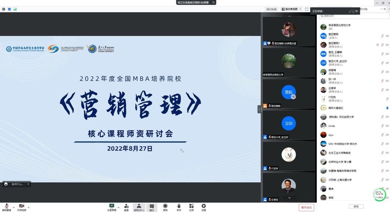 2022年8月27日,由中国学位与研究生教育学会、全国工商管理专业学位研究生教育指导委员会、复旦大学威廉体育williamhill共同举办的2022年度全国MBA培养院校“营销管理”核心课程团队研讨会顺利举行。公司何迎朝副经理、案例中心李承晋主任通过腾讯会议在线参加了本次会议。
