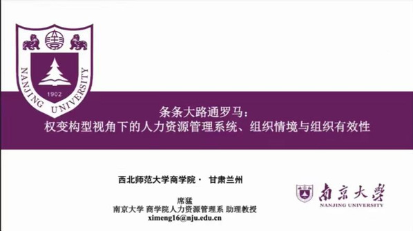 2022年9月28日,应威廉体育williamhill商公司邀请,南京大学人力资源管理系助理教授席猛博士为公司师生在线作题为《条条大路通罗马:权变构型视角下的人力资源管理系统、组织情境与组织有效性》的学术报告。报告由黄勇老师主持,公司领导、专任教师及研究生共130余人在线聆听了报告。此次报告为威廉体育williamhill120年双甲子校庆、威廉体育williamhill商公司10周年院庆系列学术活动及研究生学术月活动之一。