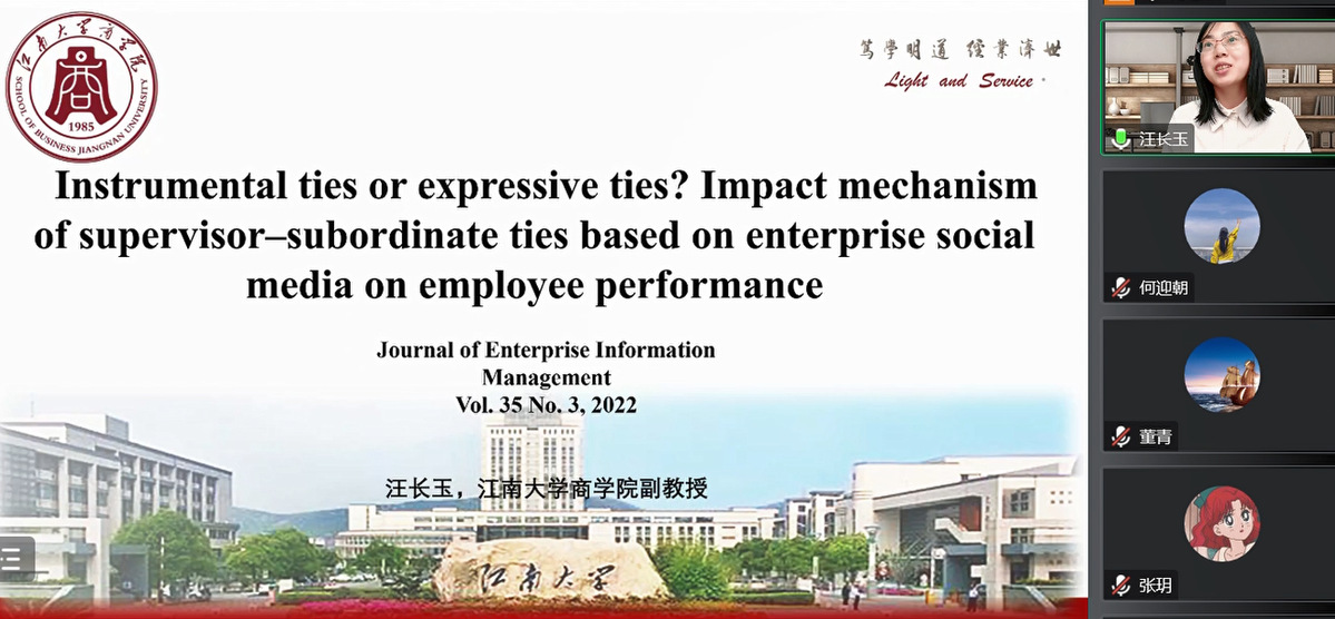 报告过程中,汪长玉副教授首先分享了本人及合作者近期发表的一篇文章。文章提出:互联网技术发展迅猛,企业社交媒体(ESM)在工作场所得到广泛应用,特别是在新冠疫情大流行的背景下,远程办公加速了ESM在企业中的应用,那么,如何用好ESM来真正提高员工的工作绩效?围绕这一问题,文章基于社会资本理论和社会交换理论,提出了5个研究假说,并通过219位使用过ESM的员工问卷数据进行了实证检验。该研究的理论贡献在于:第一,扩展了ESM使用的文献,通过调查和测试主管使用ESM与下属建立工具型和情感型连接。第二,揭示了ESM中上下级社会关系通过组织信任对员工工作绩效的影响机制。第三,将感知绩效气候考虑在内,探索ESM背景下的边界条件。第四,通过考虑社会资本三个维度之间的关系,拓展了社会交换理论的应用。该研究的实践价值在于:第一,提示企业管理者要快速提高员工工作绩效,可以直接基于ESM建立工具型连接,给予员工工作相关的支持,但线上渠道的情感型连接不能直接提高员工绩效;第二,长期来看,领导与员工间基于ESM的工具型和情感型连接都可以通过提高员工的组织信任而提高员工工作绩效;第三,组织需要关注绩效氛围的负面作用。随后,汪老师又分享了基于前文的进一步研究,该研究主要以资源保存理论和认知负荷理论为理论基础,探究领导者如何缓解企业社交媒体信息超载导致的员工职场焦虑。报告结束后,在线教师及研究生就研究数据获取、实证检验方法、理论模型构建、构念测量量表等问题与汪老师进行了互动探讨,汪老师均予以耐心、细致的解答。