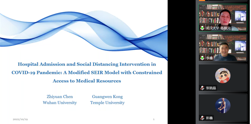 报告过程中,陈植元副教授分享了本人近期发表的一篇文章。文章提出:COVID-19是一种高传染性疾病,目前依然以较快的速度在世界绝大多数国家中传播。由于传染病医疗资源紧缺,采取何种防疫策略才能有效降低COVID-19的死亡率和传播率?围绕这一问题,文章引入了一个考虑医疗资源有限性的传染病模型,基于对中国武汉医院医护人员的调查问卷数据,分别讨论了分级医疗系统、混合医疗系统和方舱医疗系统这三种医院分级收诊策略对COVID-19的死亡率和传播率的影响。研究发现方舱系统导致的总感染人数、总死亡人数和医院占用床位数都是最少的;当医疗资源相对较丰富或轻感染患者的传播率不容忽视时,相比较于分级系统,混合系统导致的感染和死亡人数更少,但占用的床位数量更多,其原因是混合系统起到了隔离的作用。文章进一步探究了在静态和动态这两种社交距离情形下,三种医院分级收诊策略的效果。研究表明,方舱系统最大程度地减少了总感染人数和总死亡人数,尤其是在医疗资源较为紧张时。此外,文章对比分析了固定时长静默策略和床位触发动态静默策略,并发现启动时间不能太早也不能太晚,固定时长静默策略可以达到与床位触发动态静默策略相似的性能。报告结束后,在线教师及研究生就研究数据的获取和收集、理论模型两个阶段选取和构建等问题与陈老师进行了互动探讨,陈老师均予以耐心、细致的解答。