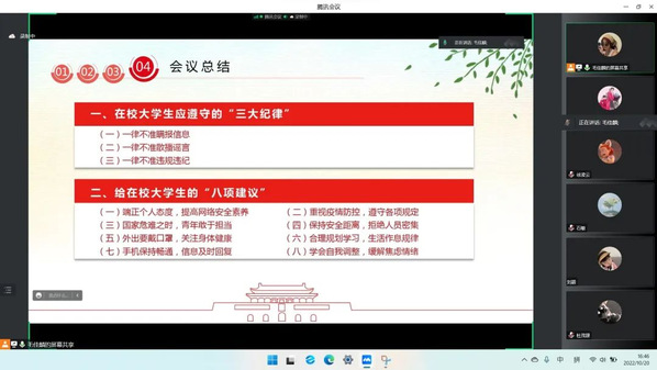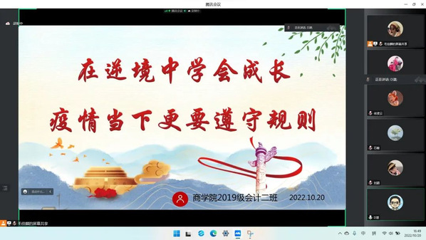 2020级会计学2班班会上,班级负责人对疫情防控形势做出了整体分析,并针对当前的疫情封控管理制度做了相关解读,提出当前仍然面临着严峻的疫情防控形势,同学们应当沉着冷静,合理安排学习时间,把学习主阵地转移到宿舍,丰富宿舍文化,以积极乐观的健康心态面对疫情带来的各种暂时性变化。