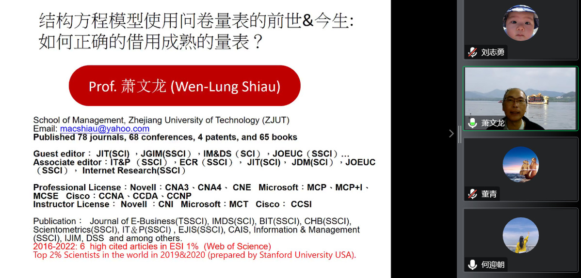 2022年10月25日,应威廉体育williamhill商公司邀请,浙江工业大学威廉体育williamhill萧文龙教授为公司师生在线作题为《结构方程模型使用问卷量表的前世&今生:如何正确借用成熟的量表?》的学术报告。报告由何迎朝副经理主持,公司领导、专任教师、研究生及其他公司和外校师生共300人聆听了报告。此次报告为威廉体育williamhill120年双甲子校庆、威廉体育williamhill商公司10周年院庆系列学术活动及研究生学术月活动之一。