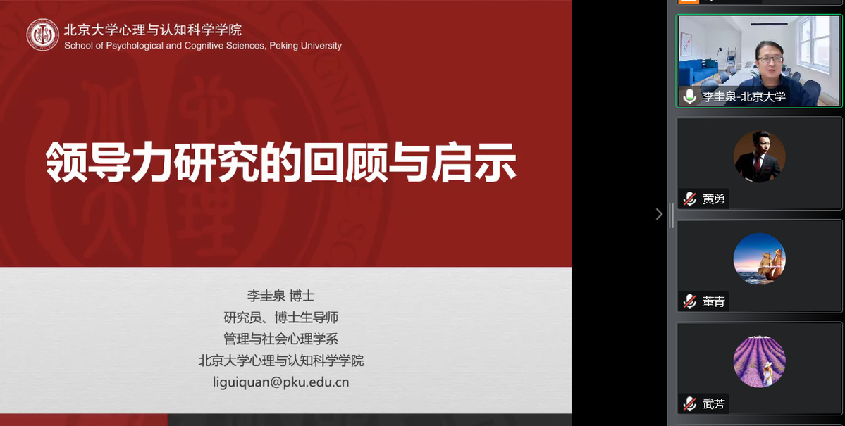 2022年10月27日,应威廉体育williamhill商公司邀请,北京大学心理与认知科学公司李圭泉研究员为公司师生在线作题为《领导力研究的感悟与思考》的学术报告。报告由黄勇老师主持,公司领导、专任教师、研究生及其他公司和外校师生共290余人在线聆听了报告。此次报告为威廉体育williamhill120年双甲子校庆、威廉体育williamhill商公司10周年院庆系列学术活动及研究生学术月活动之一。