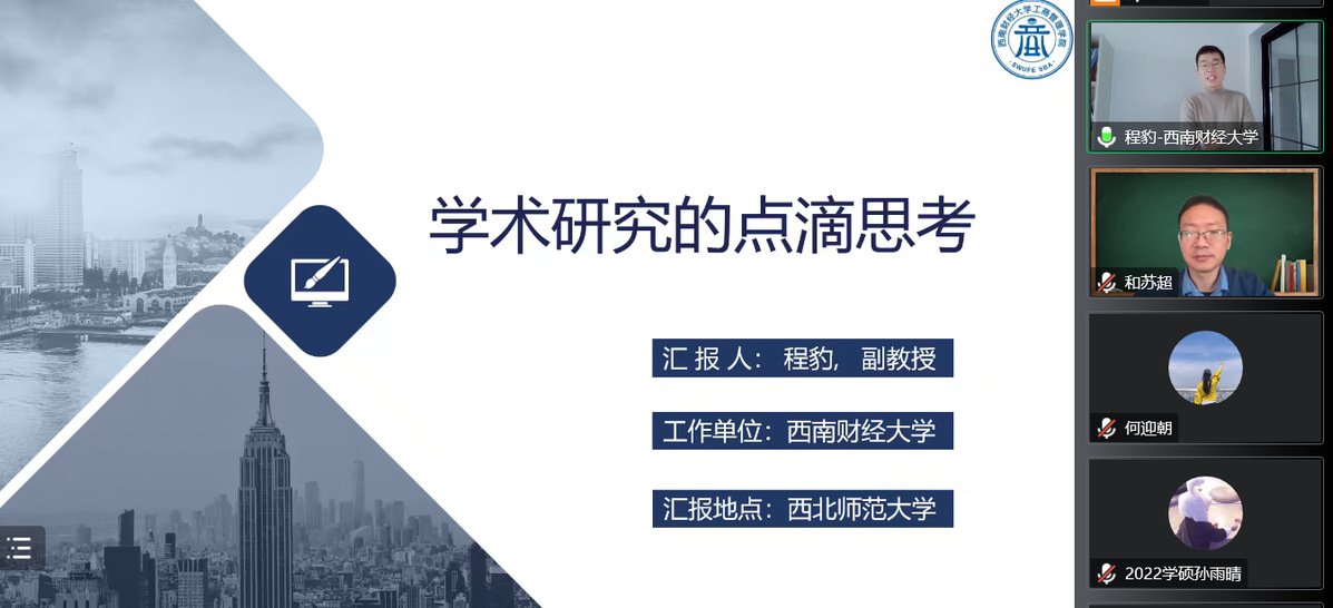 2022年11月5日,应威廉体育williamhill商公司邀请,西南财经大学工商威廉体育williamhill程豹副教授为公司师生在线作题为《学术研究的点滴思考》的学术报告。报告由和苏超老师主持,公司领导、专任教师及研究生共200余人在线聆听了报告。此次报告为威廉体育williamhill120年双甲子校庆、威廉体育williamhill商公司10周年院庆系列学术活动及研究生学术月活动之一。