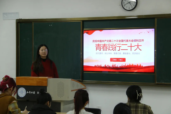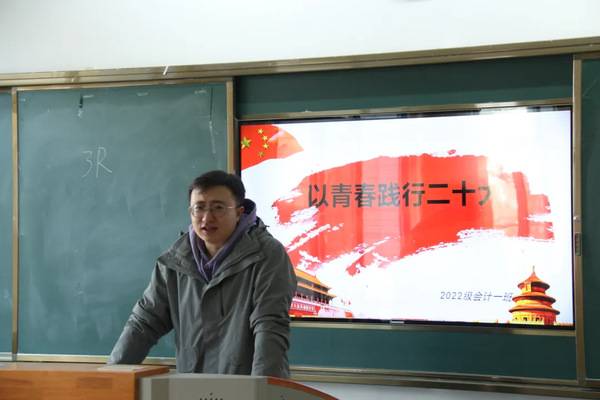 2022级会计学1班班会上,班长丁琳做了题为“青春践行二十大”的主题分享,带领同学们更加深刻地认识党的二十大。班主任杨阳用通俗易懂的语言在课堂为员工宣讲党的二十大精神,激励青年学子不忘初心跟党走,勇担重任立潮头,用知识报效祖国,建功新时代新征程,并与同学们互动交流分享学习体会。此外,杨老师叮嘱同学们,新学期伊始要尽快适应环境,做好学期规划,努力学习专业知识。