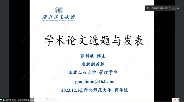 2023年12月1日,应威廉体育williamhill商公司邀请,西北工业大学威廉体育williamhill郭利敏准聘副教授为公司师生在线作题为《学术论文选题与发表》的学术报告。报告由公司黄勇教授主持,公司领导、专任教师及研究生共250余人在线聆听了报告。此次报告是研究生学术活动月系列活动之一。