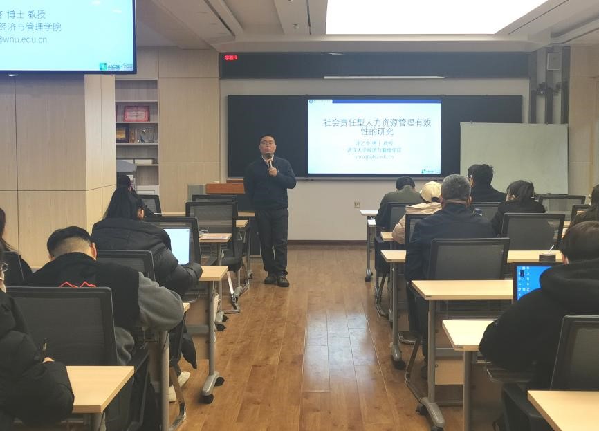 2023年12月18日,应威廉体育williamhill商公司邀请,武汉大学经济与威廉体育williamhill涂乙冬教授为公司师生作题为《社会责任型人力资源管理有效性的研究》的学术报告。报告由和苏超副经理主持,公司领导、专任教师及研究生共70余人聆听了报告,此次活动是研究生学术活动月系列活动之一。
