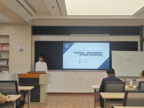 李秀秀同学从研究意义、数据来源与模型选择等5个方面进行了汇报。她的研究指出,人口问题是影响我国社会发展的基础性、全局性和战略性问题,虽然国家和地方政府均出台了人口生育鼓励政策,但全国二孩生育率仍然不高,应用机器学习算法分析我国居民二孩生育的潜力、意愿及影响因素等问题后发现,我国总体二孩生育水平较低但生育潜力较大,年龄、家庭人均收入、健康状况、配偶最高学历等因素会显著影响二孩生育意愿。