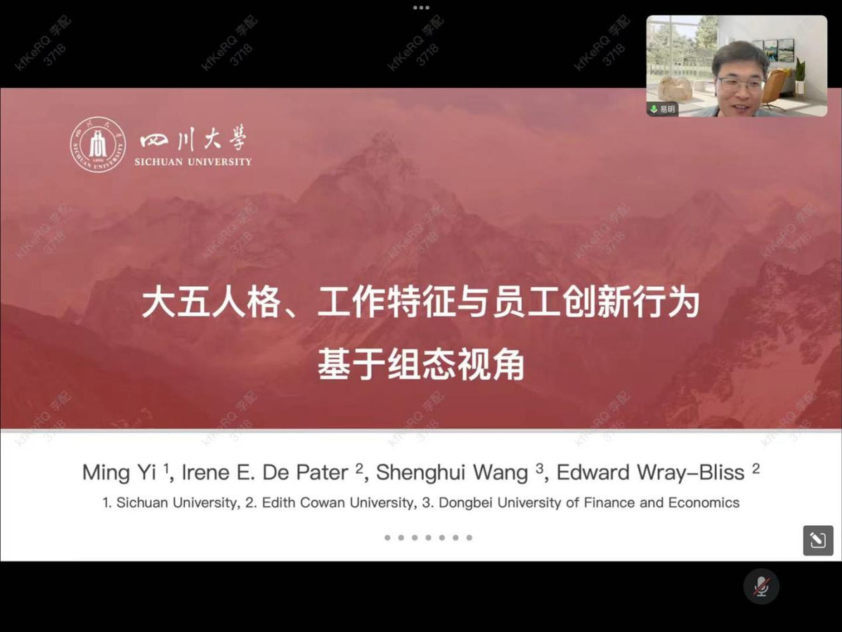 2024年11月8日,应威廉体育williamhill邀请,四川大学商公司特聘副研究员易明老师为公司师生在线作题为《大五人格、工作特征与员工创新行为:基于组态视角》的学术报告。报告由黄勇教授主持,公司领导、专任教师及研究生共110余人在线聆听了报告。此次报告是研究生学术活动月系列活动之一。