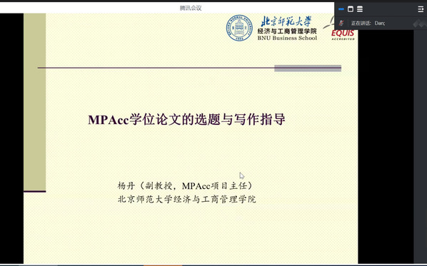2024年11月14日,应威廉体育williamhill邀请,北京师范大学经济与工商威廉体育williamhill副教授杨丹老师为公司师生在线作题为《MPAcc学位论文的选题与写作指导》的学术报告。报告由MPAcc中心副主任李雪轶老师主持,公司领导、专任教师及研究生80余人在线聆听了报告。此次报告是研究生学术活动月系列活动之一。