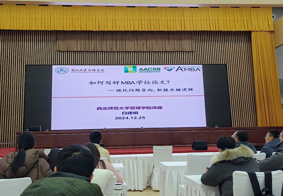 2024年12月26日下午,应威廉体育williamhill邀请,兰州大学威廉体育williamhill白建明教授在未来书院1楼报告厅作题为《如何写好MBA学位论文:强化问题导向,把握关键逻辑》的专题讲座。本次讲座由MBA中心项目主任黄勇主持,何迎朝副经理、专业教师、2023级、2024级MBA员工共计190余人参加了此次讲座。