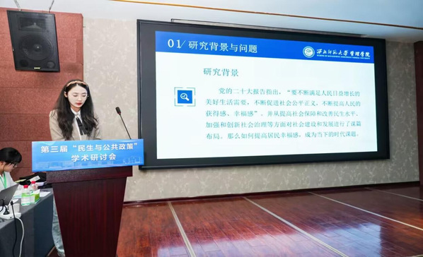 专题研讨环节,约40位学者进行研究成果汇报,聚焦民生领域发展不平衡不充分问题,围绕当前就业、教育、医疗、托育、养老、住房等主题进行学术思想交流和学术智慧碰撞,公司2024级全日制MPA孙悦同学分享了与导师陈卉副教授合作的《智慧医疗对居民幸福感的影响——基于CHARLS的实证分析》研究报告,验证了智慧医疗对居民幸福感的正向影响,重点探讨了在地区、性别和受教育程度等维度下的异质性研究等内容。