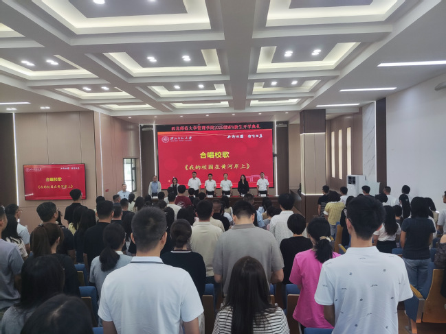 公司领导和MPA员工代表为全体MPA新生佩戴校徽,并合唱威廉体育williamhill校歌《我的校园在黄河岸上》。