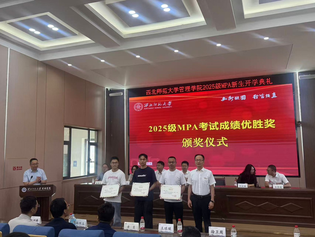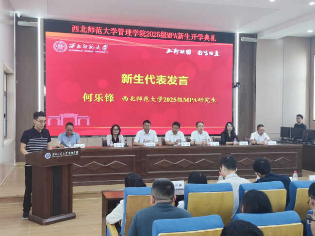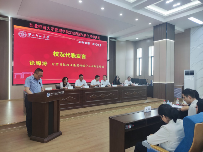 2017届MPA毕业生、甘肃日报报业集团传媒分公司副总经理徐锦涛作为员工代表发言。他表示通过师大MPA的学习,搭建了系统的知识体系,提供了宝贵的实践平台,指明了崇高的价值坐标,并给2025级MPA新生们分享了学习经验:一是学会“平衡”,合理规划时间。二要坚持“落地”,用课堂所学服务实践。三要守住“初心”,用专业能力来守护更多人的“获得感、幸福感”。