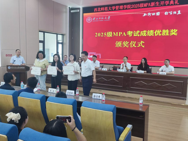 管理公司党委书记张强和经理董青为2025级MPA考试成绩优胜奖励获得者颁奖。