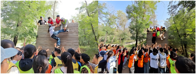 压轴项目是4米高的“毕业墙”,同学们需搭成人梯,在无工具辅助下全员翻越。三名男生主动充当“基石”,墙顶的队员奋力拉拽,其他同学协力帮助并呐喊加油。当最后一名同学成功登顶时,同学们欢聚一起为团队的胜利欢呼。