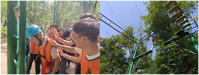 8米高的“高空断桥”,给同学们尤其是女生带来了很大的内心挑战,但在队友的鼓励下,大家逐个迈出关键一步。一名同学感慨地说:“站在高处时,腿抖得厉害,但听到下面的呐喊声,突然觉得恐惧可以被战胜。”最终,全员成功完成挑战,深刻体会到“困难往往源于自我设限,勇气才是突破的钥匙”。