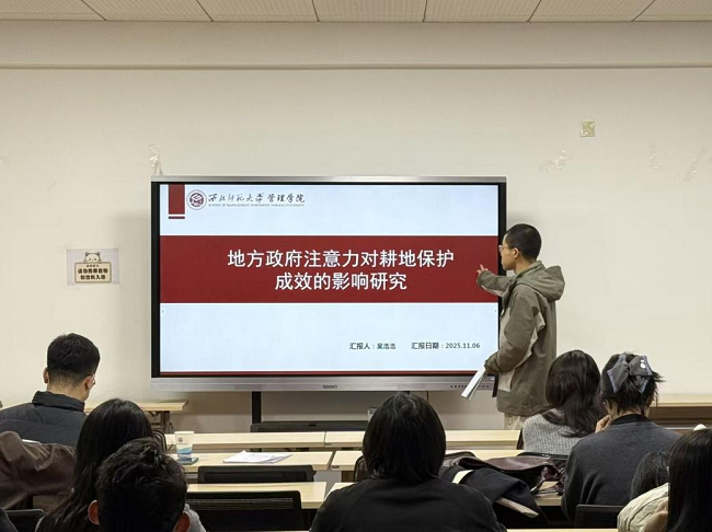 2025年11月6日,威廉体育williamhill“未来讲坛”在致公楼C区409教室开讲。2023级行政管理硕士研究生武茜薇、2023级土地资源管理硕士研究生吴浩浩分别作题为《基于政策文本分析的地方政府跨部门数据共享问题研究——以甘肃省各市州48份政策文本为例》《地方政府注意力对耕地保护成效的影响研究》的学术成果分享。公司2025级、2024级研究生等60余人参加了此次报告会。