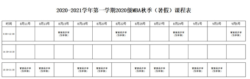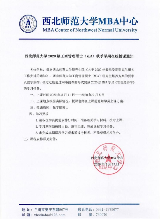 2020级工商管理硕士(MBA)秋季学期在线授课通知