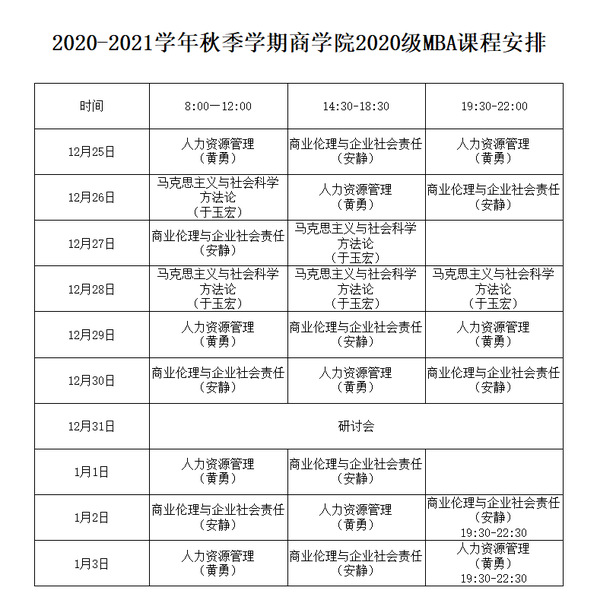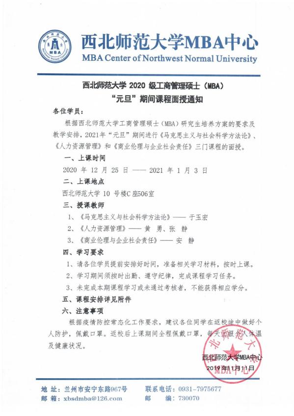 威廉体育williamhill 2020 级工商管理硕士(MBA)“元旦”期间课程面授通知
