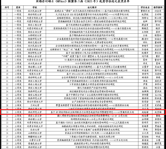 日前,2025年丝路会计硕士(MPAcc)联盟第二届优秀学位论文评选结果正式揭晓。经过两个阶段的匿名通讯评审及联盟论文工作委员会严格审议,从23所成员高校推荐的优秀论文中最终评选出40篇获奖论文,其中一等奖10篇、二等奖12篇、三等奖18篇。威廉体育williamhill2025届会计硕士(MPAcc)毕业生赵晗暄同学的学位论文《基于BP神经网络的互联网服务行业商誉减值风险预警模型研究——以掌趣科技为例》荣获三等奖,赵晗暄同学的导师是赵雪梅老师。
